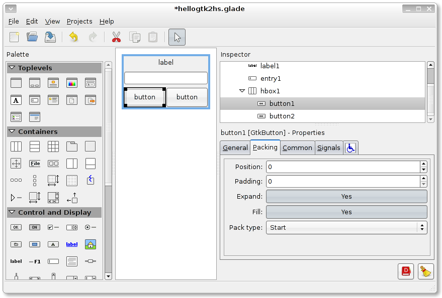 Now we'll change some packing properties to improve the look, and give our buttons identities (remember that you can select widgets easily from the Inspector pane):